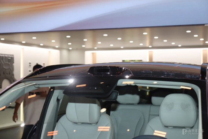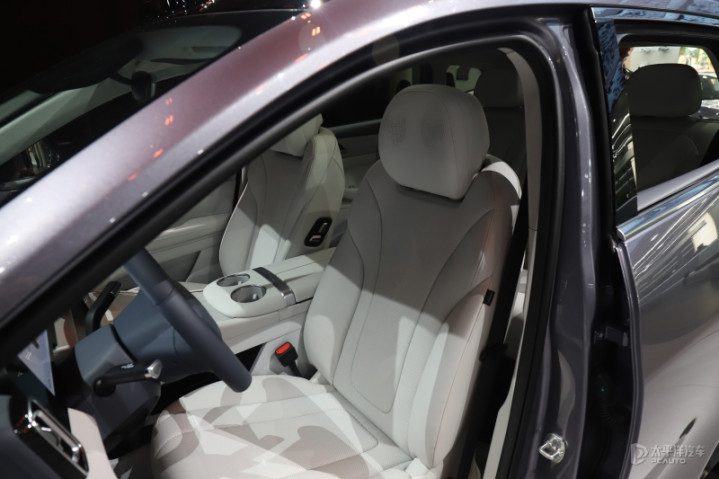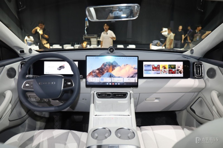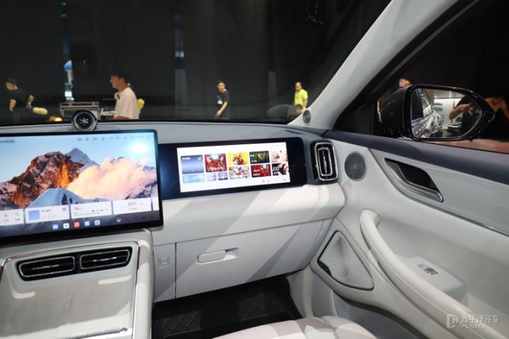 内部配有三款屏幕,包括副驾娱乐屏,悬浮式中控屏下方配有空调出风口和手机无线充电面板。另外悬浮式中控屏上方还有圆形电子表设计。车内搭载双辐式方向盘,其次门板和中控台都有氛围灯设计。